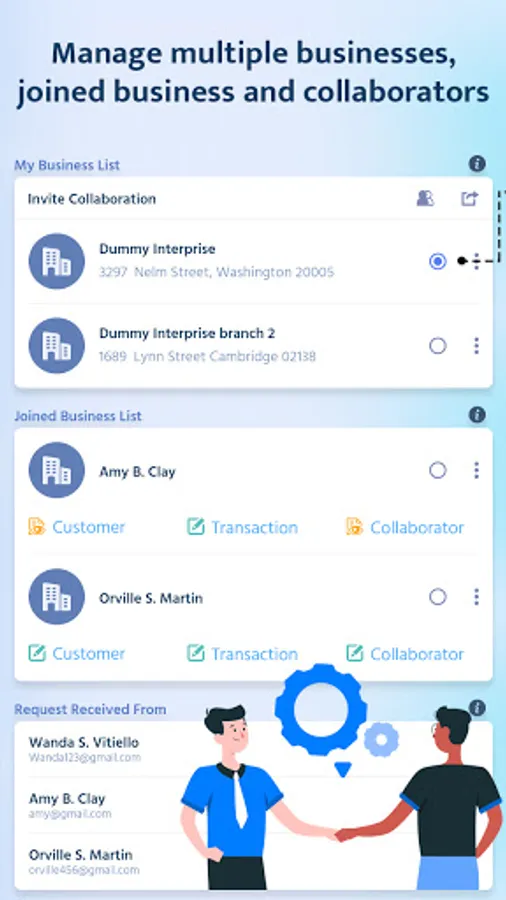- You can also join other businesses using barcode code scan or ‘Collaboration code’.