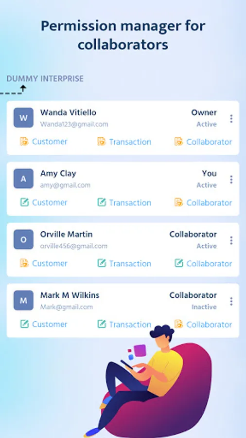 - Manage user level permission for customer, transaction and collaborator’s view, edit permissions.