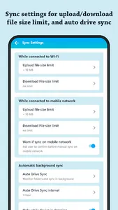 By enabling auto drive sync feature you can sync the data automatically after specified time interval. You can set the auto drive sync interval time. For auto drive sync, you can set the minimum battery level and preferred internet connection.