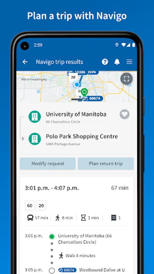 The Winnipeg Transit app gives you easy access to all the information you need to ride transit in Winnipeg. Get real-time schedules near you. Plan a trip using Navigo. Go live with On the Go. Find route maps and information.
