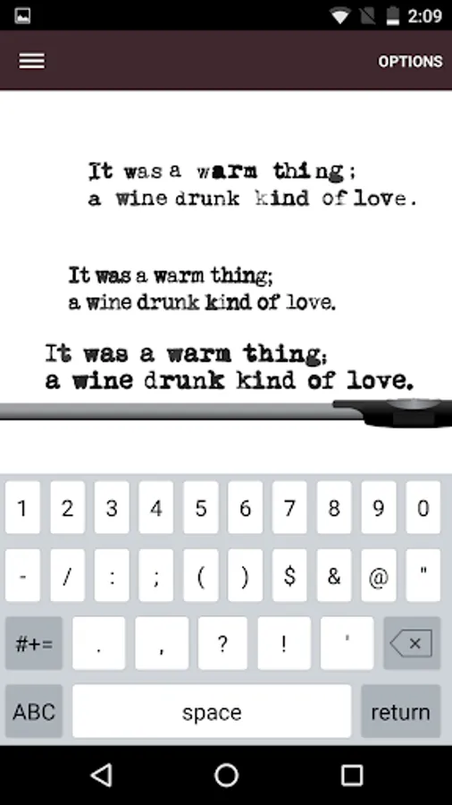 Some advantages My Typewriter has over other typewriter apps are the ability to delete mistakes, a longer page to be better-suited for long-form works, a font randomizer, a selection of vintage fonts to choose from, and the ability to move the cursor around manually in order to play with poetic form or to function like a traditional word-processor.