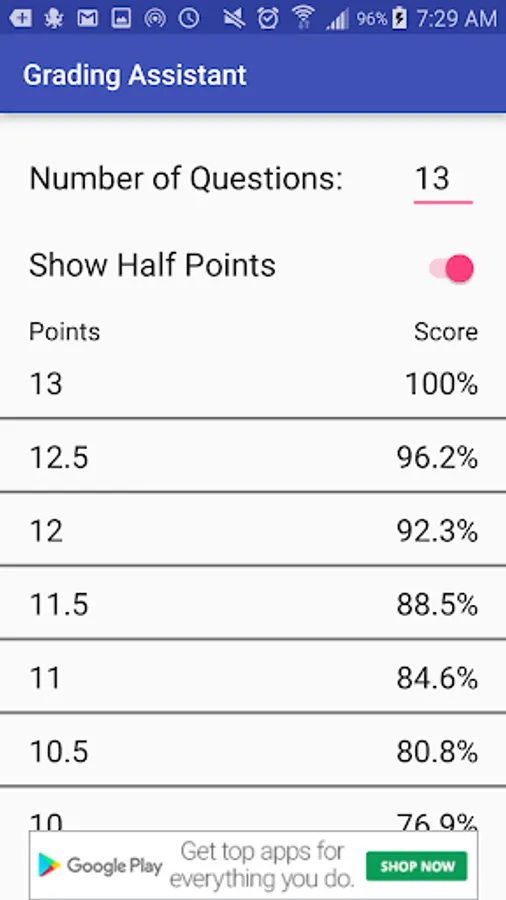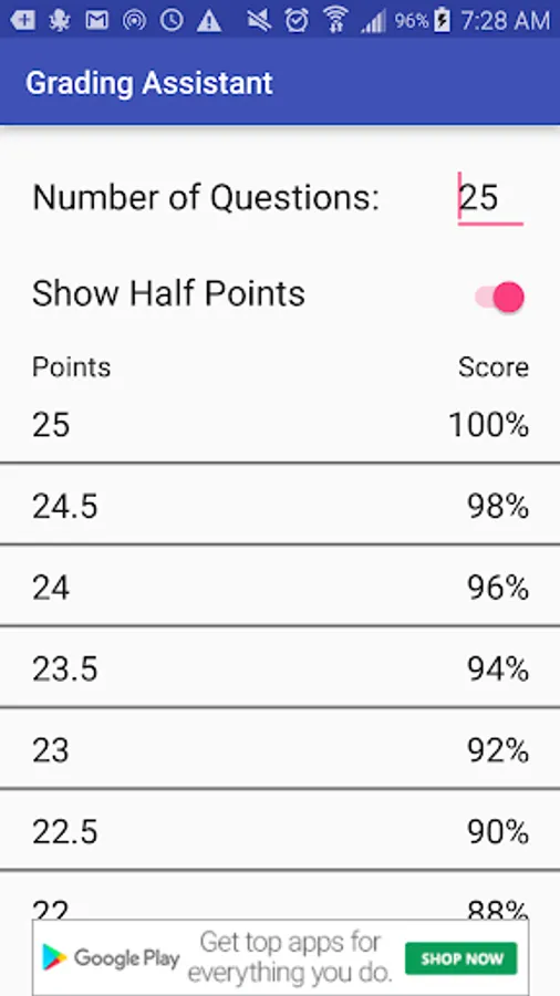 Set the total number of points. Then scroll to the desired value to find the percent grade.