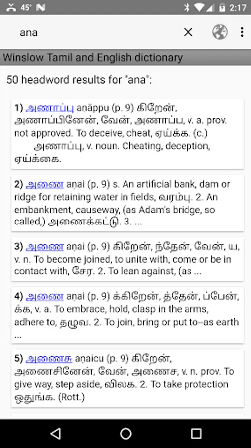 Search results come first in a numbered list that displays the Tamil headword, the accented latin transliteration of the headword, and a chunk of the definition. To see a full definition, touch the list item.