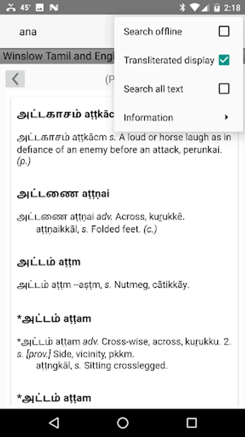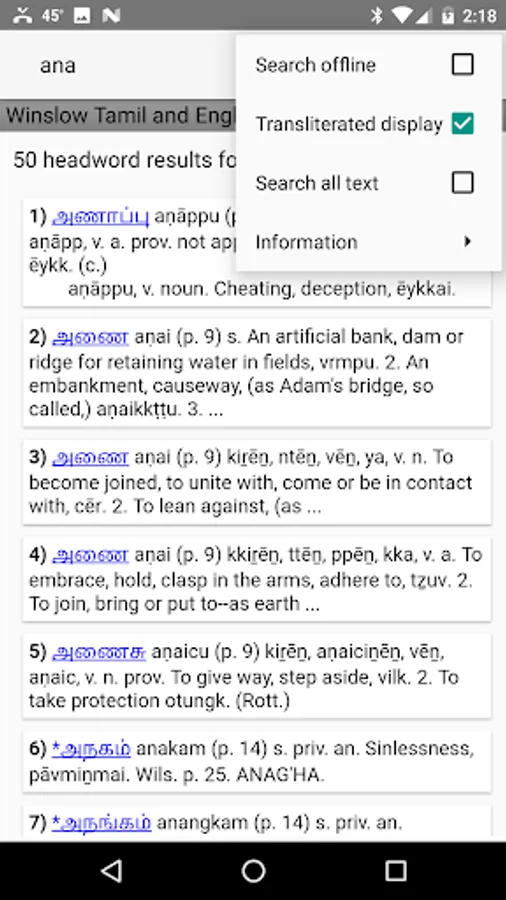 The user can also choose to see results definitions fully transliterated. In the overflow menu (three vertical dots icon at the top right corner of the screen), simply touch "Transliterated display."