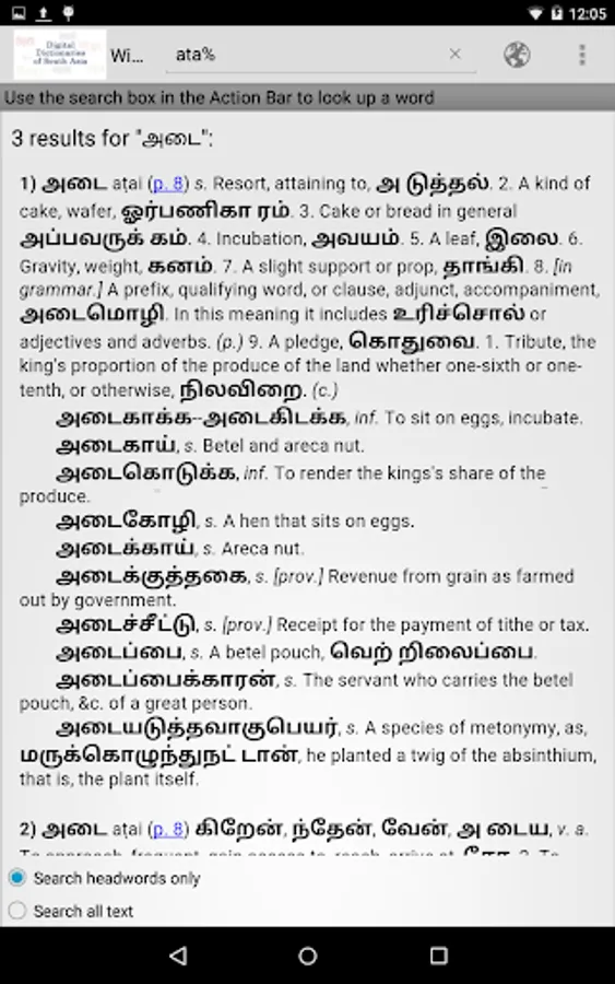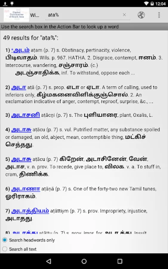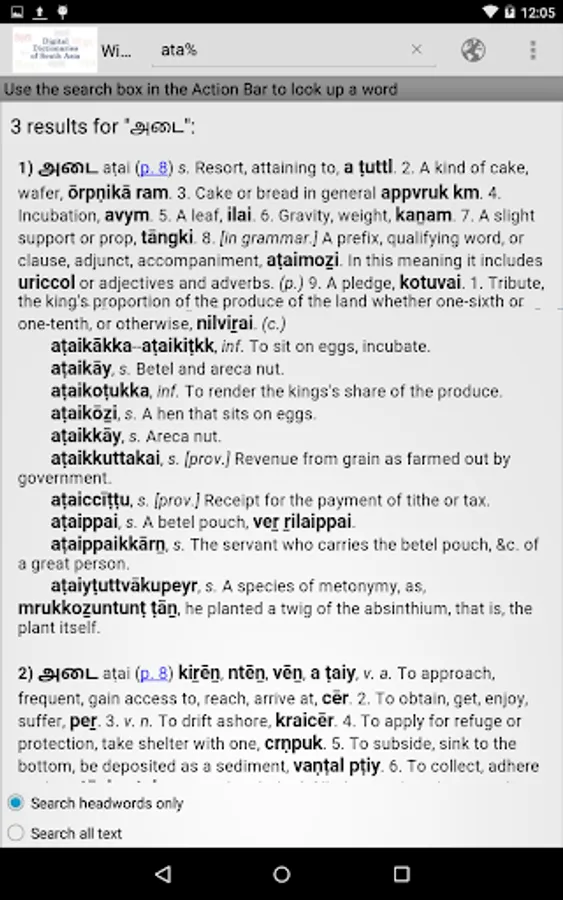 The default mode for this app is to search headwords. To search for a headword, touch the search box at the top (magnifying glass icon) to expose the on-screen keyboard and begin searching. Headwords can be entered in Tamil, accented latin characters, and unaccented latin characters. For example, headword searches for உபாகமம், upākamam, or upakamam will all yield a definition about "a class of books secondary to the Agamas."