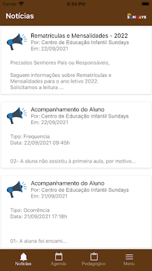 Application of the Sundays Children's Education Center that allows consultations to the bulletin, tuition, school hours, disciplinary follow-ups, in addition to having a school agenda and news panel for efficient communication between the school, students and guardians.