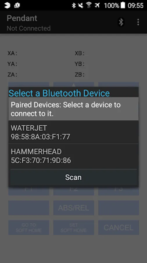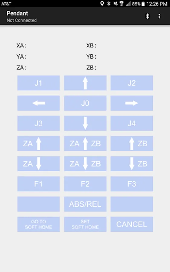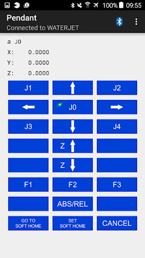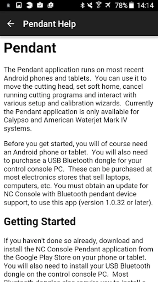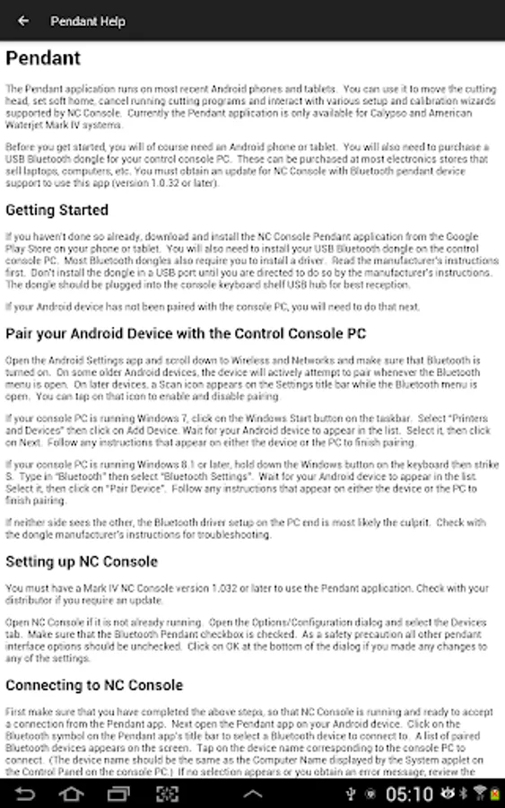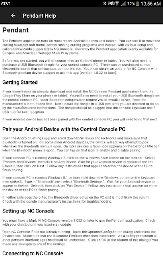 The NC Console Pendant app replaces a hardwired pendant for use with NC Console software on Calypso Waterjet and American Waterjet gantries with Mark IV controls. The Pendant app runs on most recent Android phones and tablets and connects to your control console PC over a Bluetooth link. You can use the Pendant app to move the cutting head, set soft home, cancel running cutting programs and interact with various setup and calibration wizards.