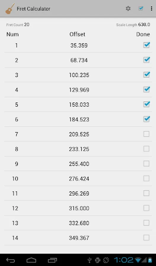 You enter the scale length (expressed in the units of your choice) and the number of frets, and Fret Calculator computes the values.