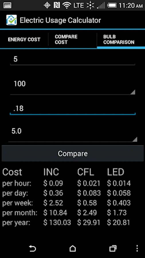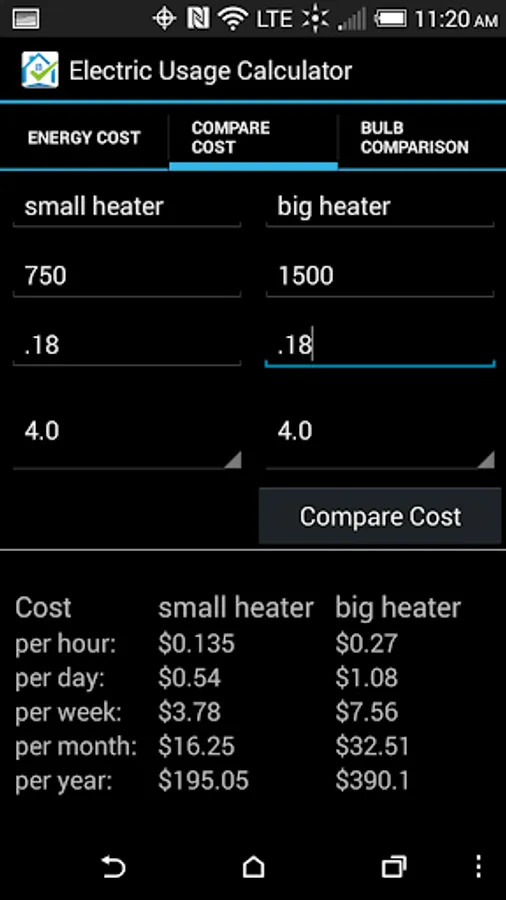 This is an easy-to-use FREE app and it only takes a few minutes to get downloaded and using on your android device. It has three main functions: it will help you to calculate energy cost associated with a specific device as long as you know the watt’s of the unit and your average electricity cost, you can compare the energy consumption/cost between two appliances in your household, and you can calculate light bulb savings to better understand the savings associated with changing out light bulbs.