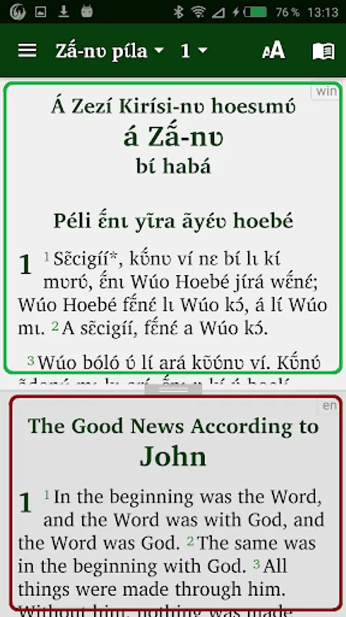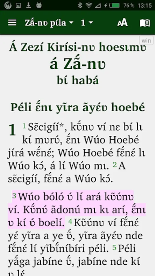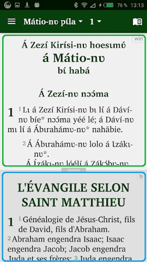 - "verse by verse" to display a verse in Winye followed by the same verse in French or in English.