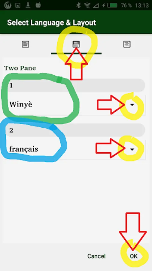 - "two panes" to display the Winye at the top and the French or English version at the bottom
