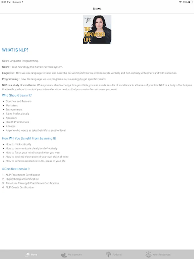 My training and experience as a Trainer of NLP, Hypnosis Trainer, Time Line Therapy® Trainer, NLP Coach Trainer and Master Life Coach have given me the tools to help my clients to live a fully EMPOWERED LIFE!