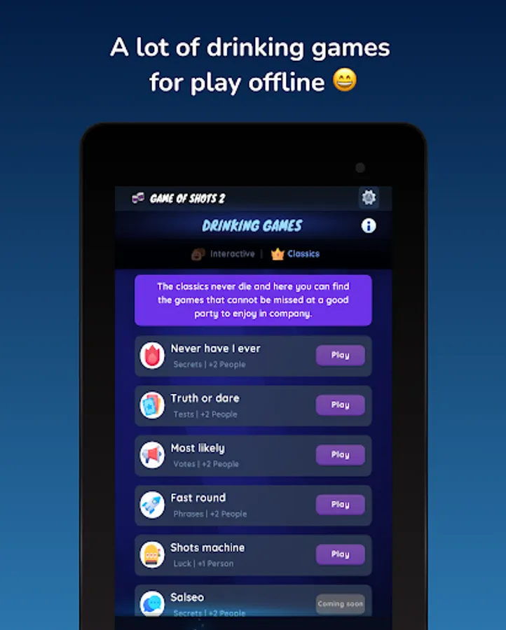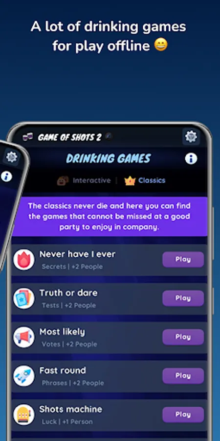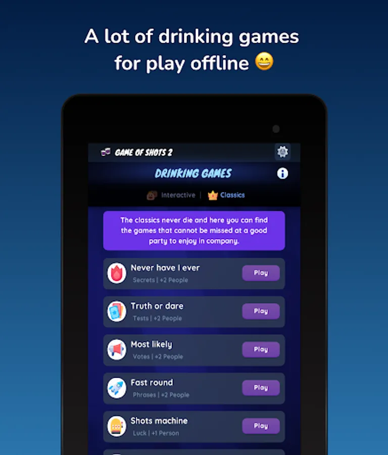 😎 In Game of Shots 2 ® (drinking games) you can find the hottest and most extreme games, with the hottest questions and challenges. If before there was intimacy between your friends or partner, after this game everyone will know your most hidden secrets.