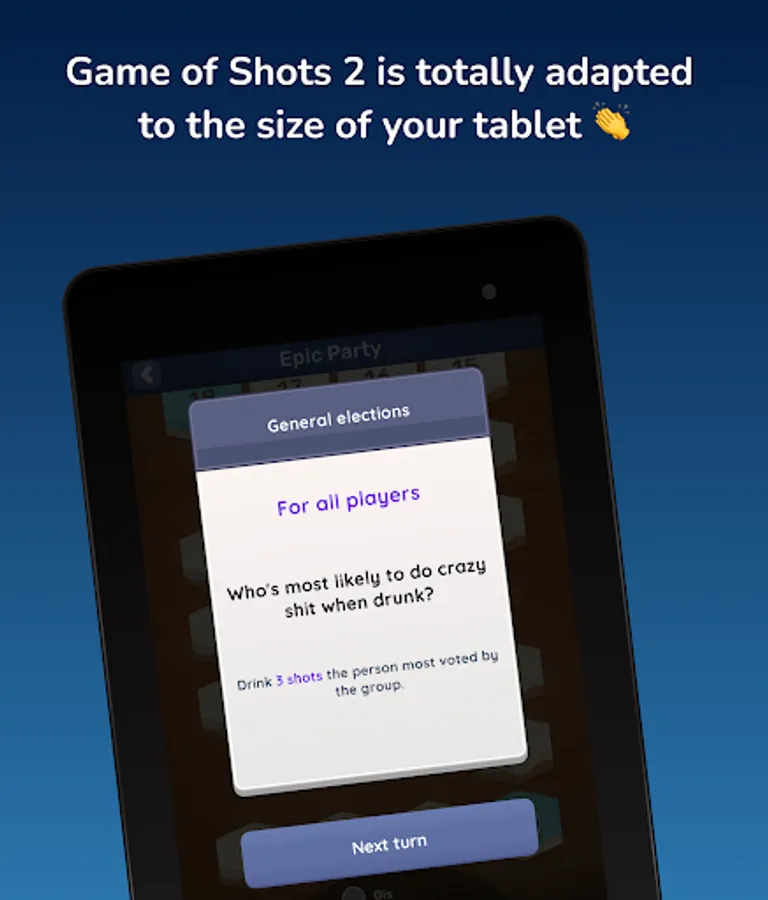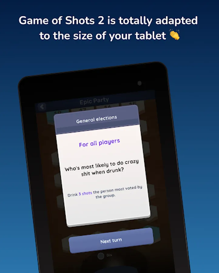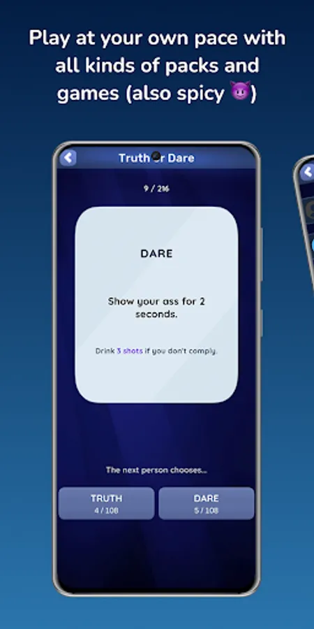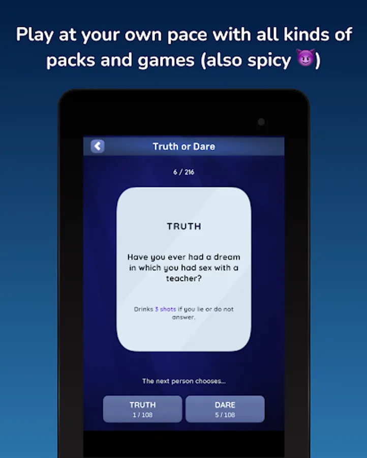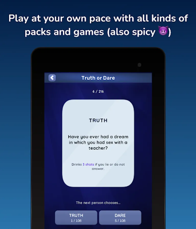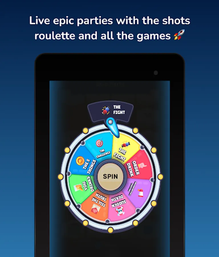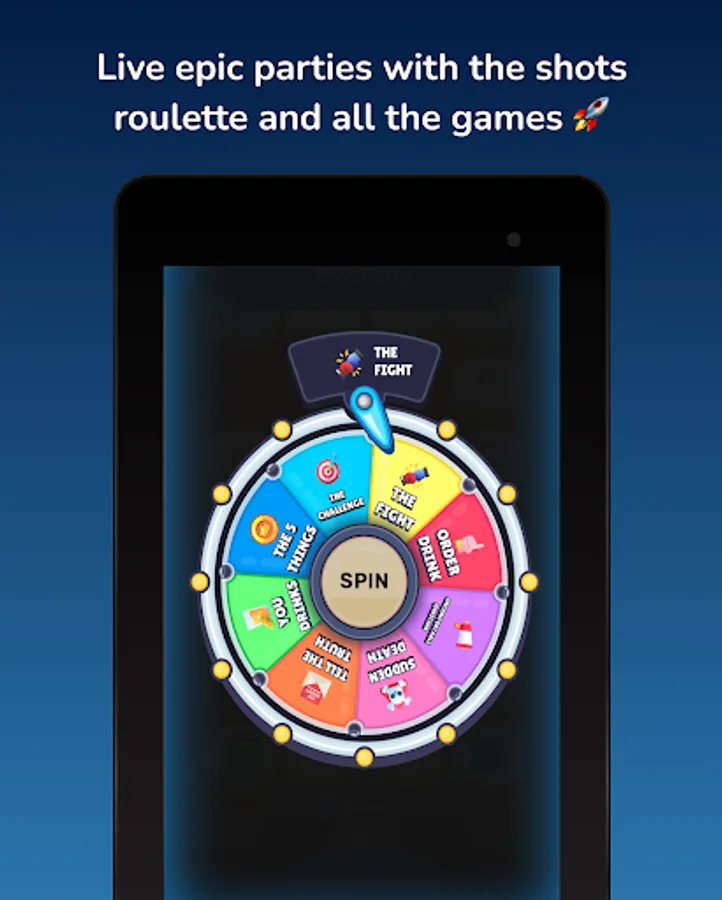🥳 Remember, in Game of Shots 2 you can play that classic games like Never Have I Ever, Truth or Dare, Most Likely, Quick round, etc. Also with the party mode you play against other friends. Roll the dice, dares and let the wheel decide your fate. You are about to experience an epic night totally free!