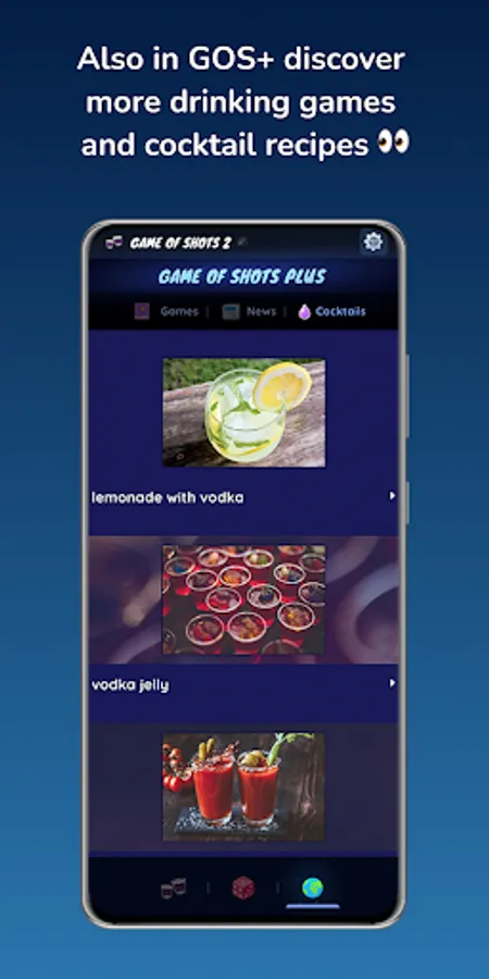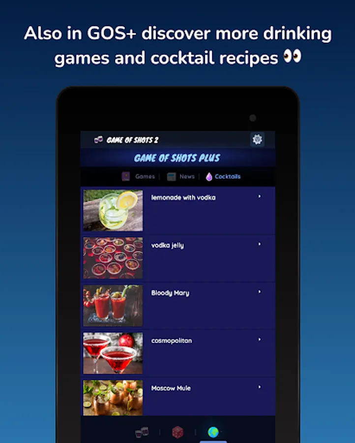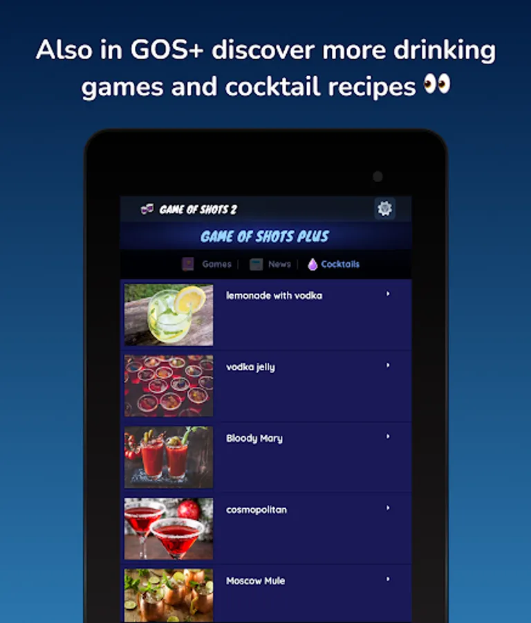📣 Also in Game of Shots 2 ® (drinking games) you have GOS+ a section where you can discover more instructions for drinking games that are played around the world and a section with recipes to prepare cocktails.
