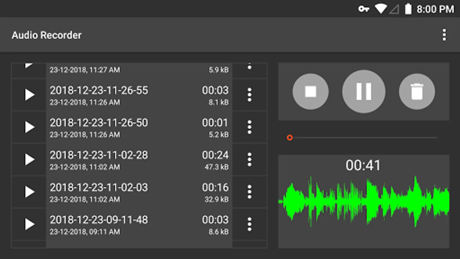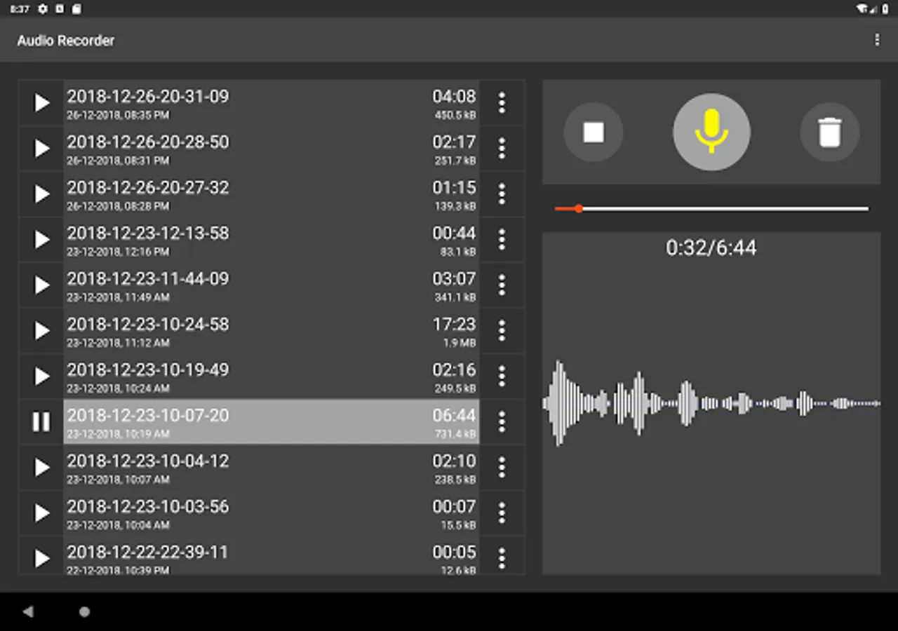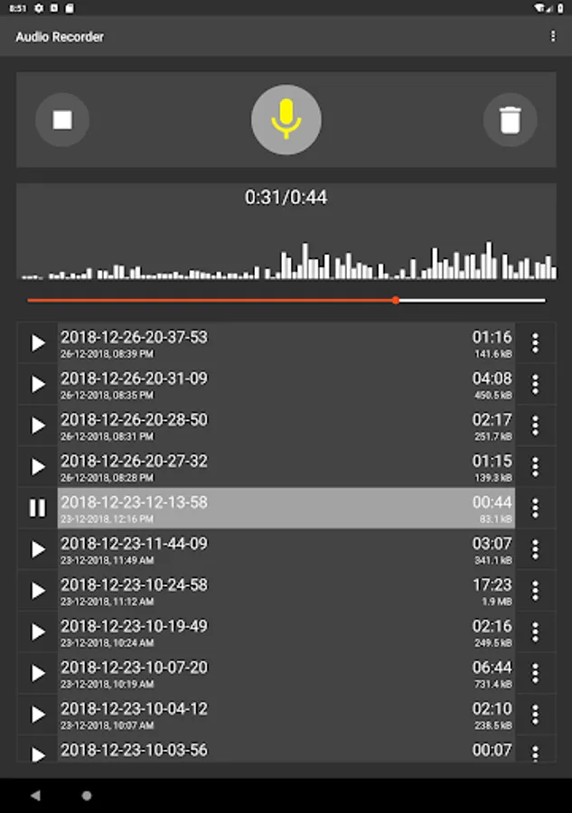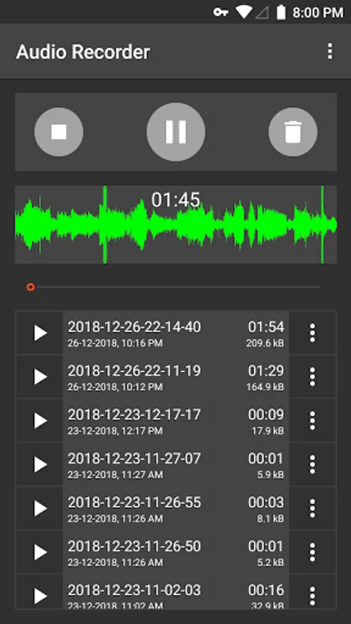 The design of this audio recorder app is very simple and easy to use. The recordings can be started and played on the same screen. The recordings are shown in the list, new recording are shown at the top of the list (sorted by date).