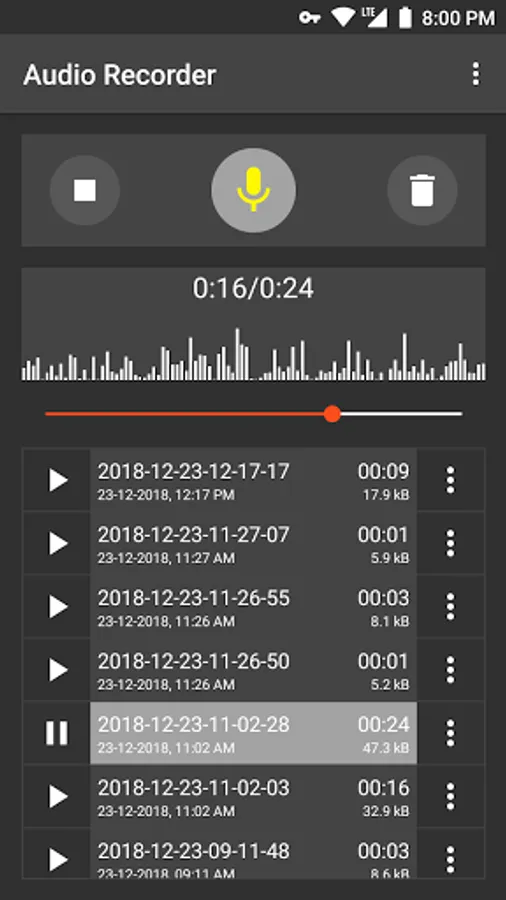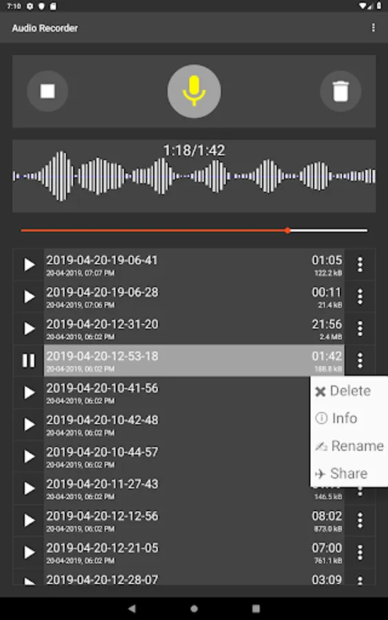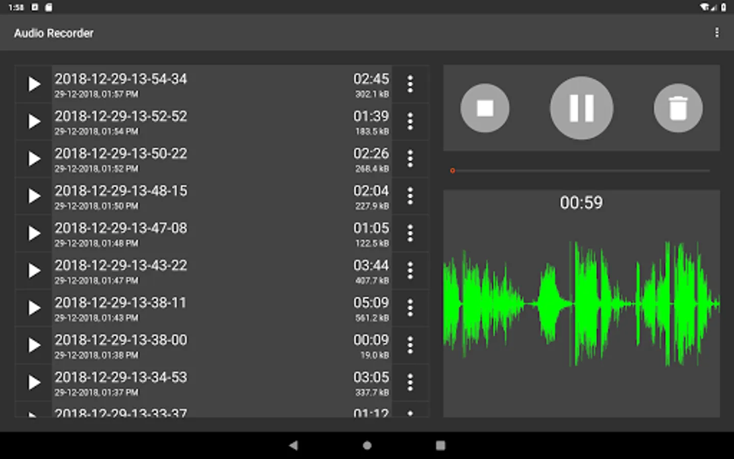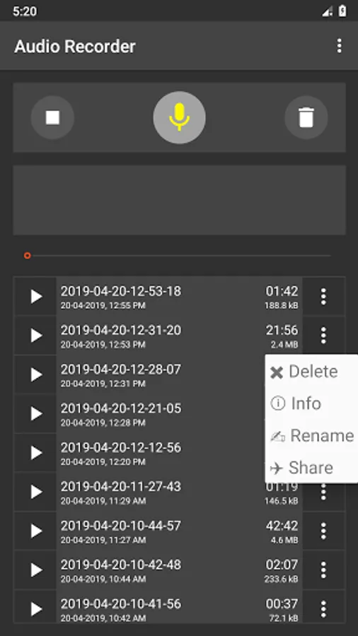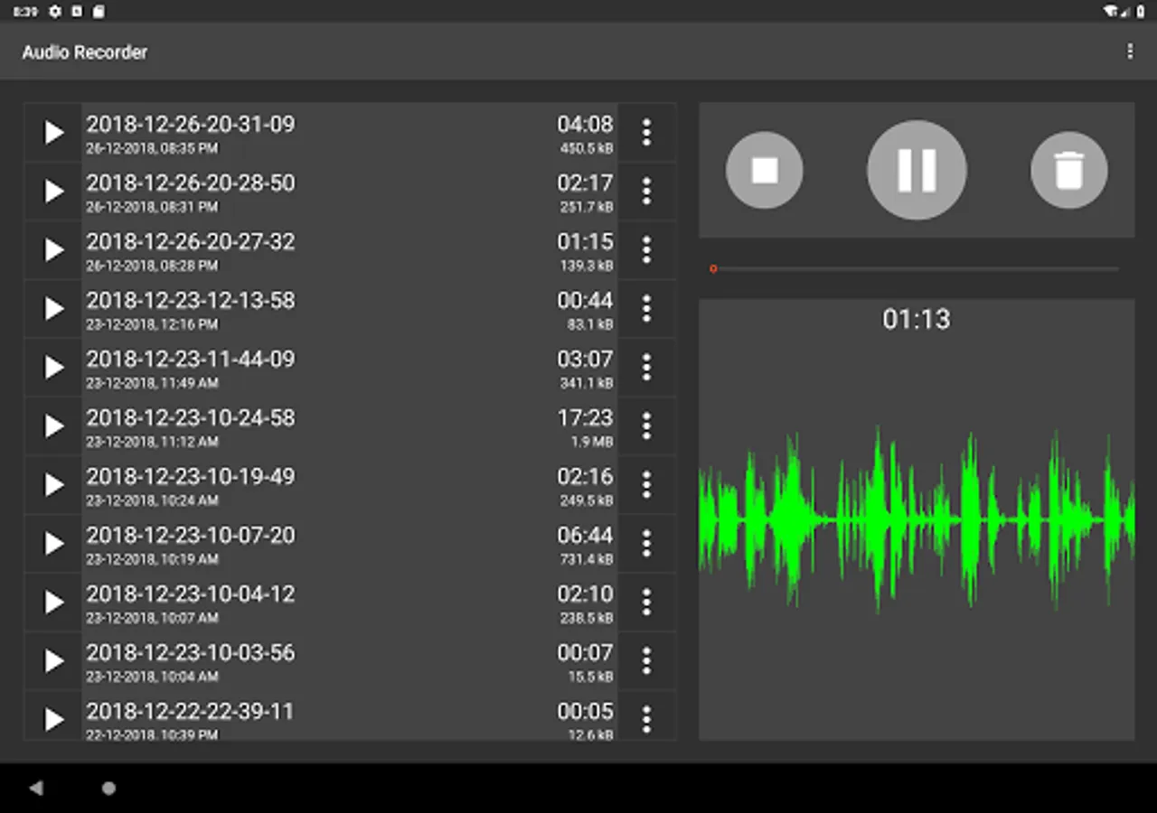 The design of this audio recorder app is very simple and easy to use. The recordings can be started and played on the same screen. The recordings are shown in the list, new recording are shown at the top of the list (sorted by date).