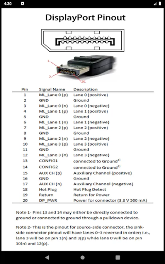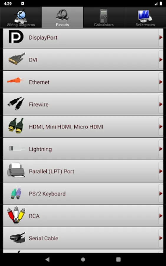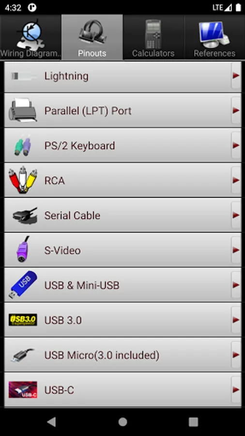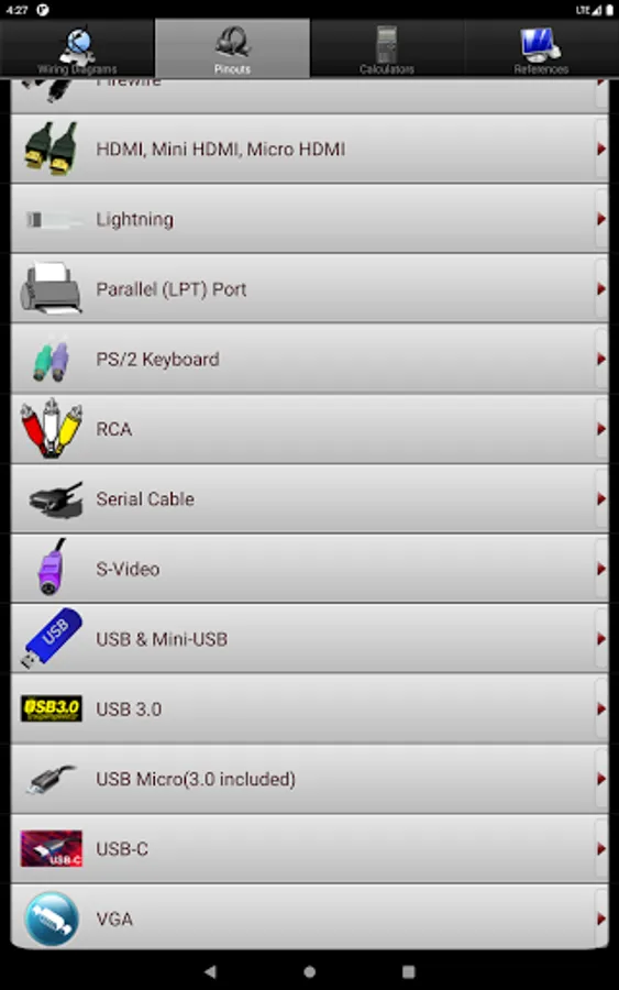 *Cable Pinouts: Component, DisplayPort, DVI, Ethernet, Firewire, HDMI, Mini HDMI, Micro HDMI, Lightning, LPT(parallel port), PS/2, RCA, Serial port, S-video, USB 3.0, Mini-USB, Micro USB, USB-C, and VGA.