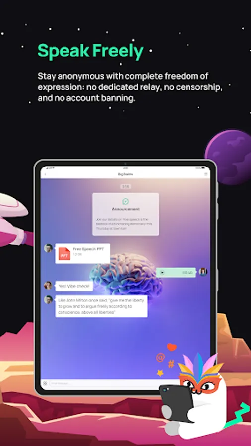 E2EE voice calls, chat groups with no limit on the number of participants, file transfer without a size limit, clean and clear UI design, multi-device login, dark and light mode themes, and more for you to explore!