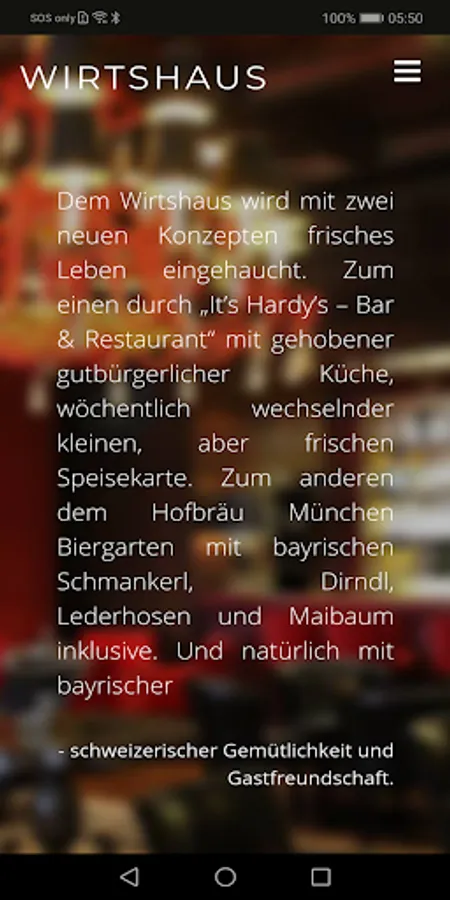 Dem Wirtshaus wird mit zwei neuen Konzepten frisches Leben eingehaucht. Zum einen durch „It’s Hardy’s – Bar & Restaurant“ mit gehobener gutbürgerlicher Küche, wöchentlich wechselnder kleinen, aber frischen Speisekarte. Zum anderen dem Hofbräu München Biergarten mit bayrischen Schmankerl, Dirndl, Lederhosen und Maibaum inklusive. Und natürlich mit bayrischer