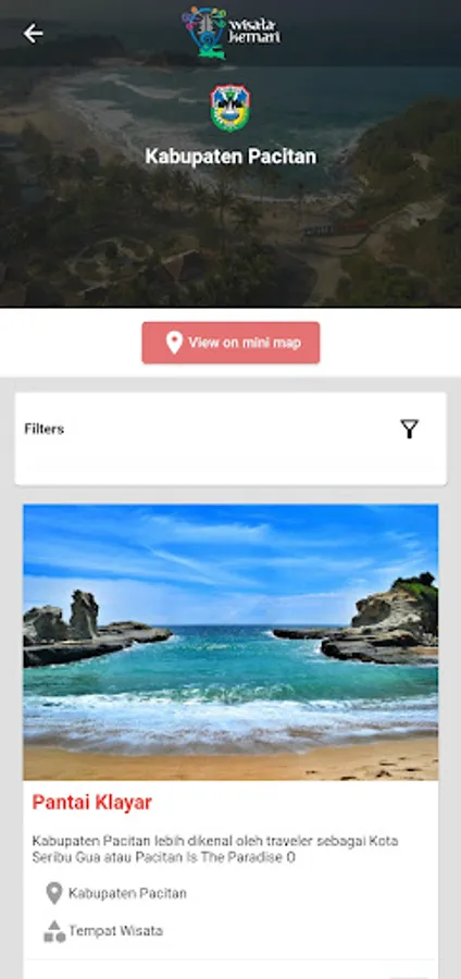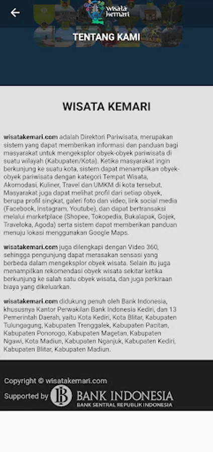 Wisata Kemari or Wisatakemari.com is a Tourism Directory, a system that can provide information and guidance for the public to explore tourism objects in an area (district/city). When people want to visit a city, the system can display tourism objects with the categories of Tourist Places, Accommodation, Culinary, Travel and MSMEs in that city. The public can also view the profile of each object, in the form of short profiles, photo and video galleries, social media links (Facebook, Instagram, Youtube), and can transact through the marketplace (Shopee, Tokopedia, Bukalapak, Gojek, Traveloka, Agoda) and the system can provide guidance to the location using Google Maps.