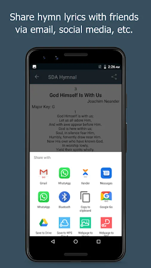 Digital version of the Seventh Day Adventist Hymnal. Contains 695 songs with lyrics neatly displayed. This app features a display of the hymn's key signatures and tunes, of the hymns, you can listen to.