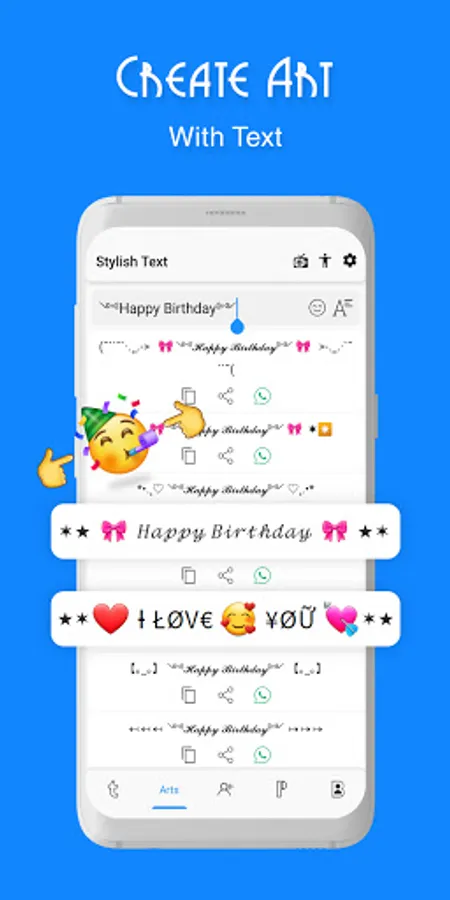 Write Stylish Text and Art and share them in your favourite chat app like WhatsApp, Snapchat, Instagram, Facebook, Hangouts and every other app which supports editing text to impress everyone.
