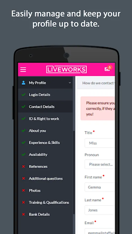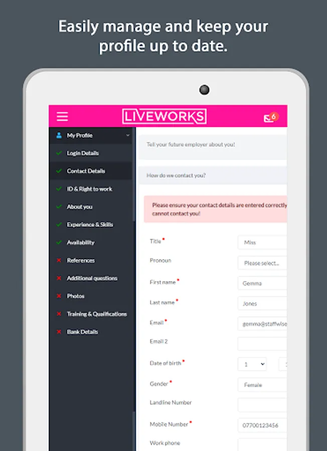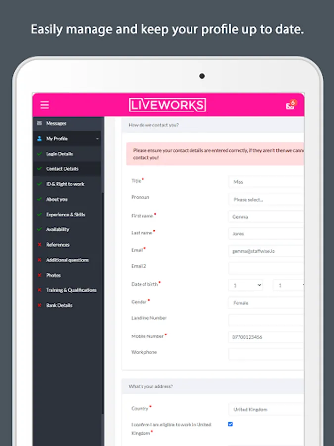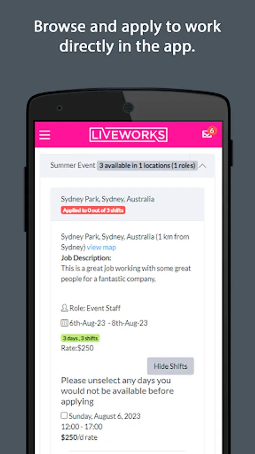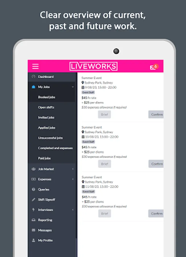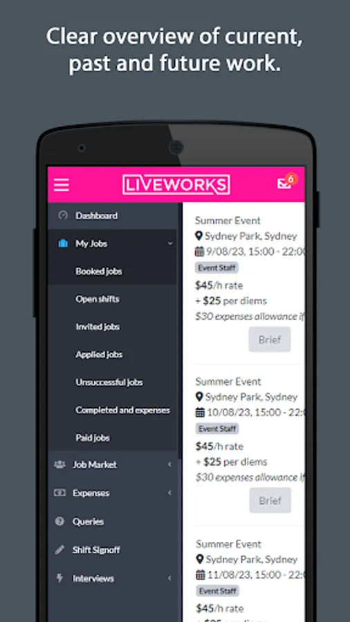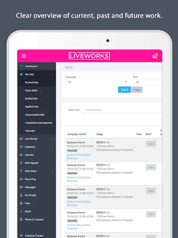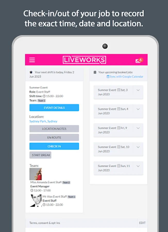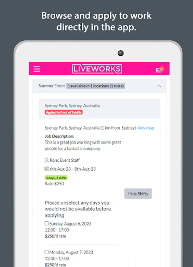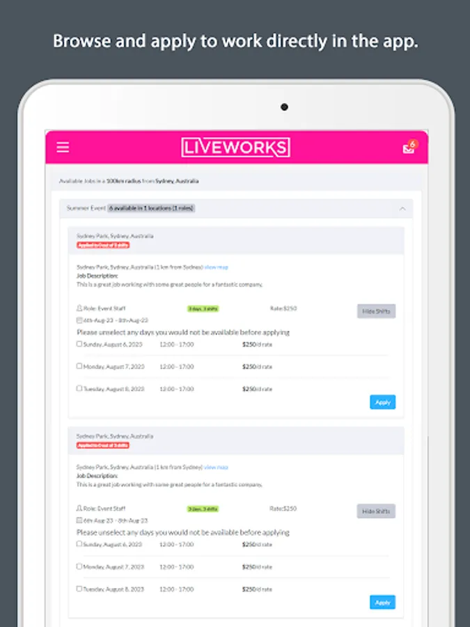At LiveWorks, our people are our passion. We're committed to ensuring our pay rates are always competitive and fair, constantly benchmarking them to stay ahead of the game. With our app, you'll tap into a world of opportunities by browsing our exclusive 'Jobs Market' and keeping your availability up to date, guaranteeing you never miss out on that thrilling role with your favorite brand. Bid farewell to the hassle of confirming your arrival with unnecessary phone calls—our app allows you to seamlessly check-in and check-out for each shift.
