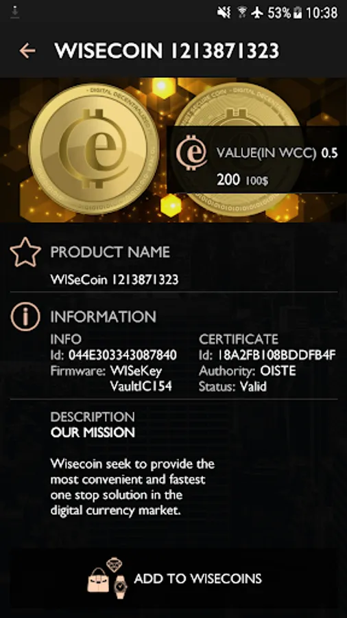 The WISeCoin can be protected into a personal Digital Vault and associated with a personal identity to establish ownership over the Coin and cryptocurrencies.