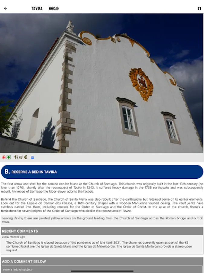 It includes offline maps, camino variants, lodging and sightseeing suggestions, and offline mapping capabilities. It also included the ability for you to leave your own suggestions for pilgrims following behind you.