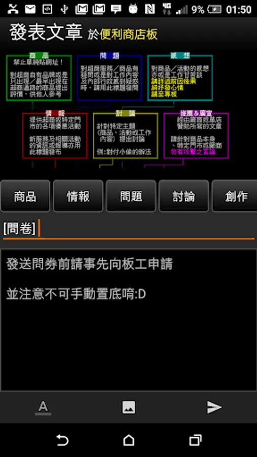 * 唯一發文會顯示發文須知的App,發文分類輕鬆點選即可載入分類範本,輕鬆在手機上發文不用擔心觸犯板規。