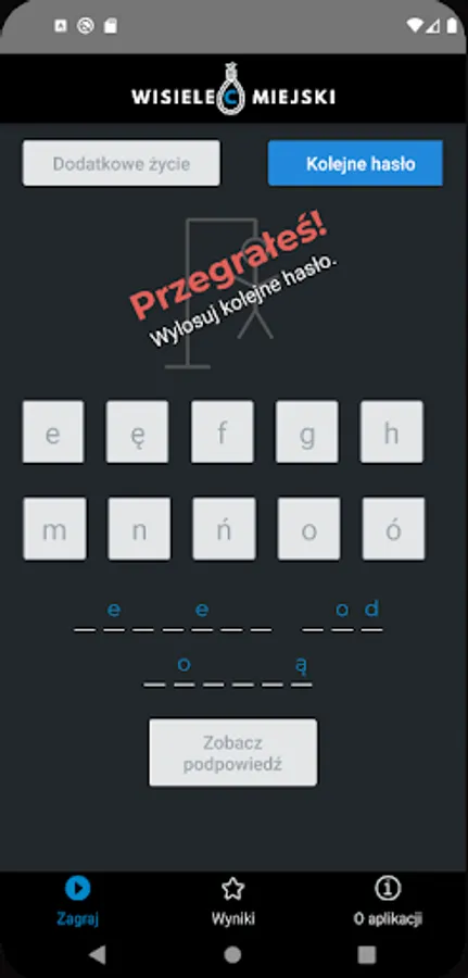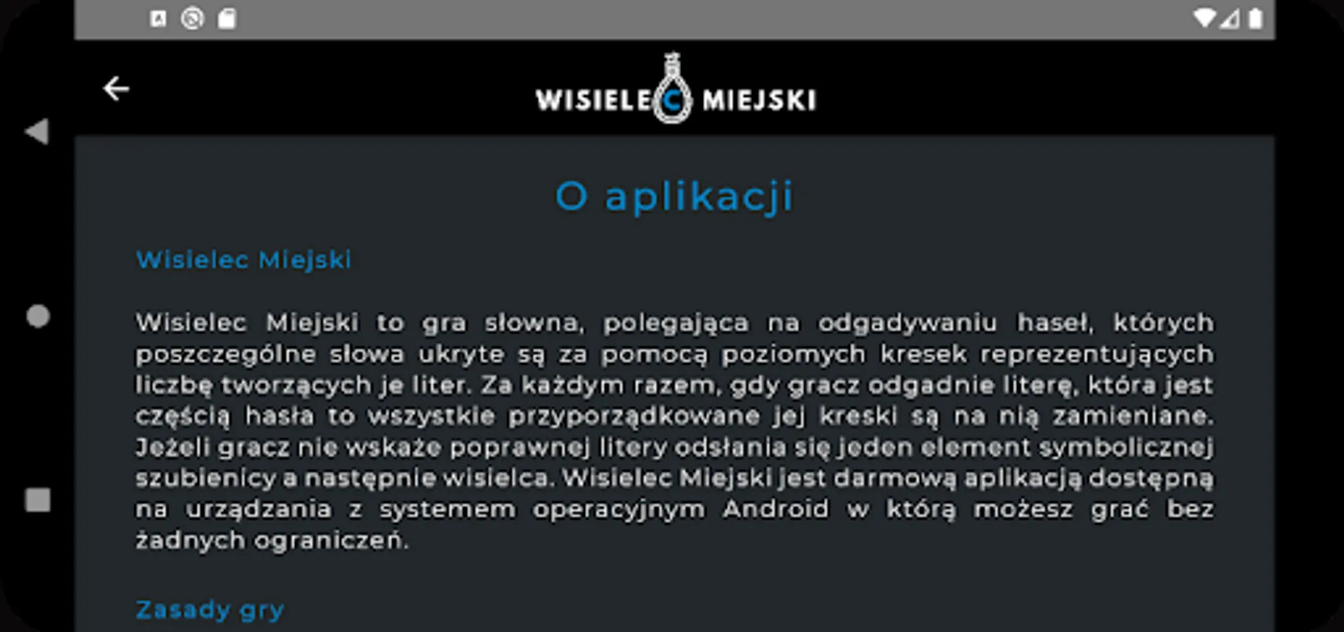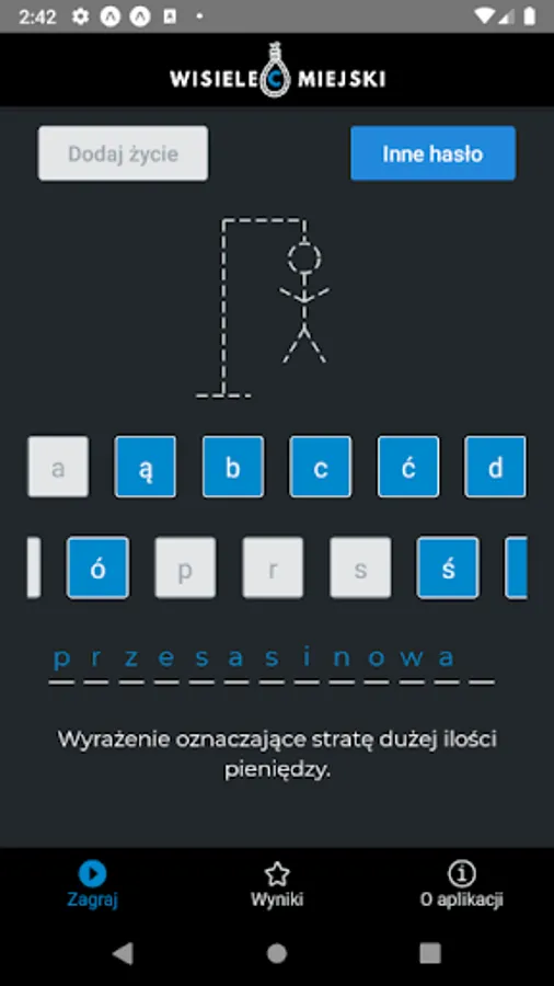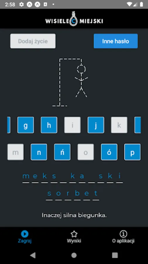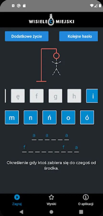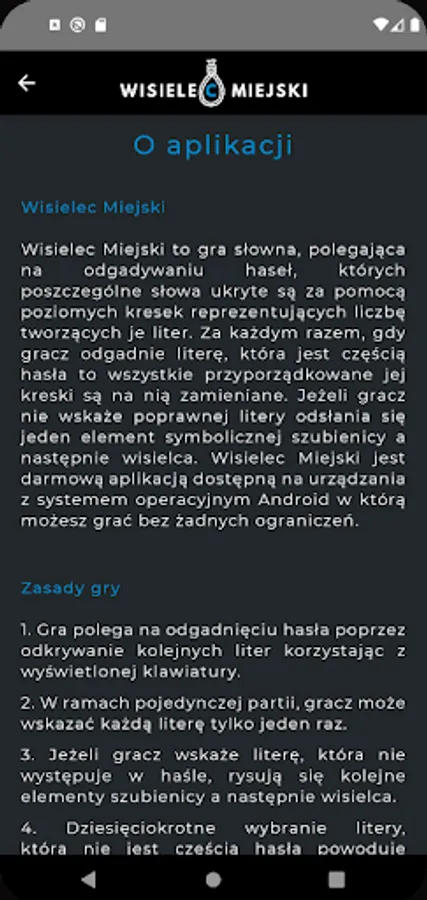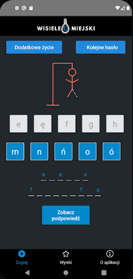 The City Hangman is a word game that consists in guessing passwords, the individual words of which are hidden by means of horizontal dashes representing the number of letters forming them. Each time the player guesses a letter that is part of the password, all assigned dashes are replaced with it. If the player does not choose the correct letter, one element of the symbolic gallows is revealed, followed by the hanged man. Hangman City is a free application available on devices with the Android operating system that you can play without any restrictions. The password base consists of colloquial expressions used and well understood by young people.