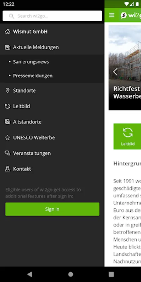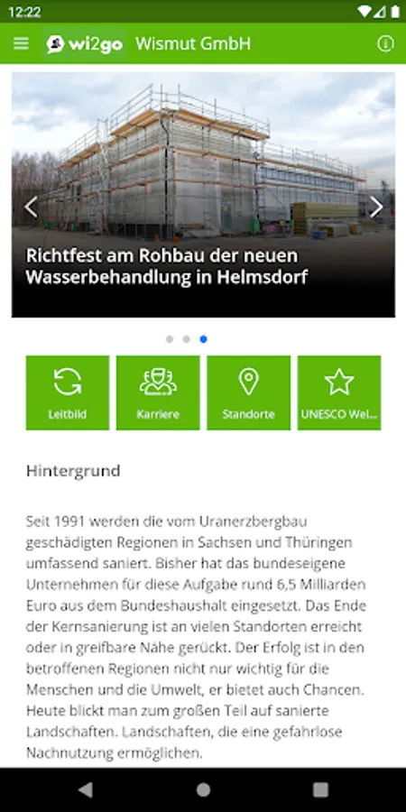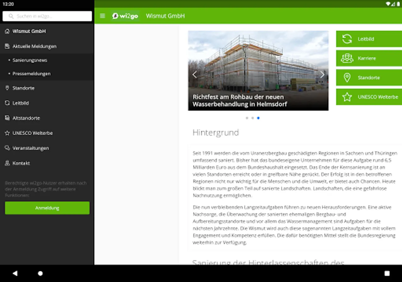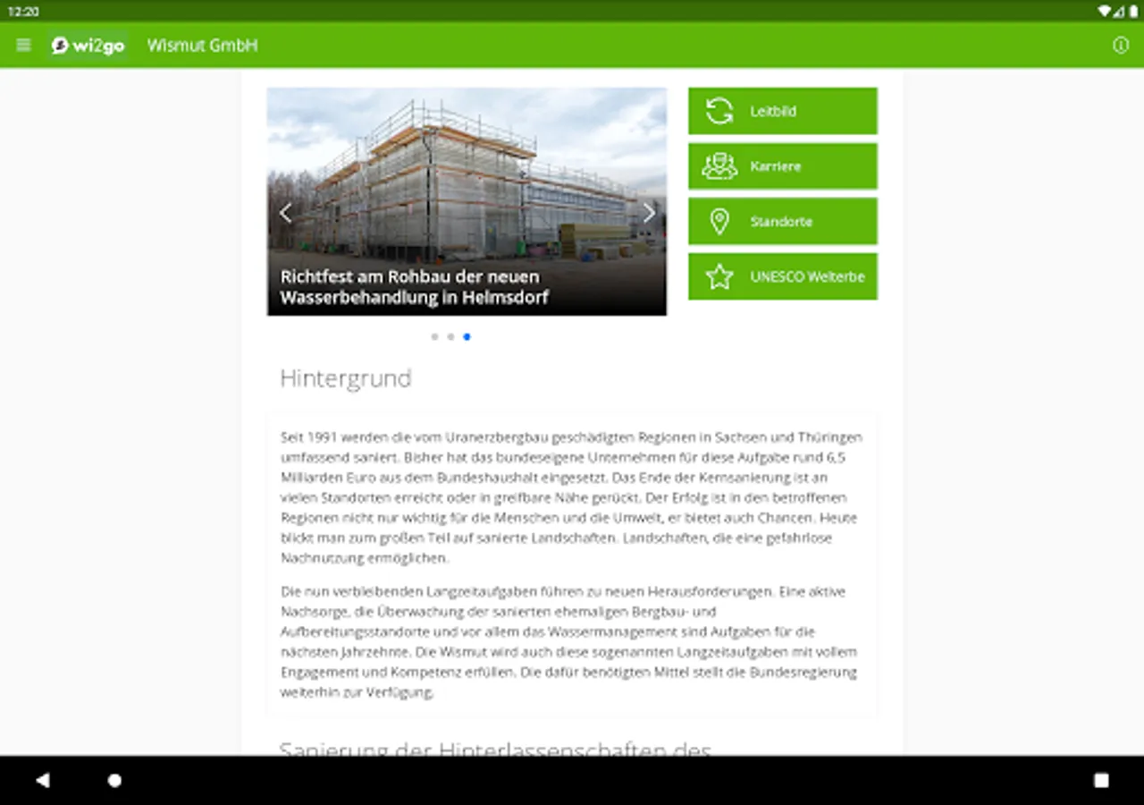 wi2go offers you the opportunity to stay informed about current events, interesting projects, dates and much more about Wismut GmbH - mobile, fast and up-to-date.