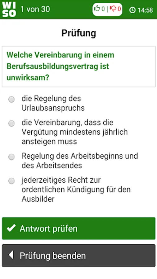 Based on an analysis of industrial-technical and commercial audits in examination subject Economic and Social Studies (WISO) of recent years have been "learning WISO!" For more than 350 questions created with answers and explanations, you should know for your final exam. Of course, you can learn only individual subjects for exam preparation. All features of this Lernapp were tailored to the needs of pupils and developed according to their wishes.