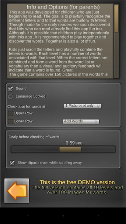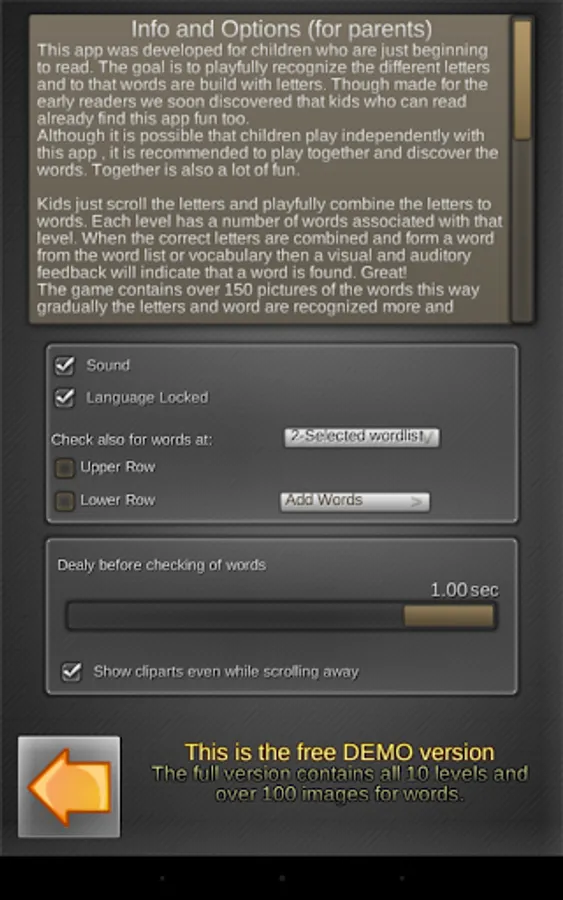 The game contains over 150 pictures of the words this way gradually the letters and word are recognized more and more.. A kind of learning by visual imprint. But really it's just fun!