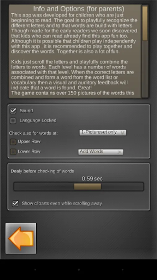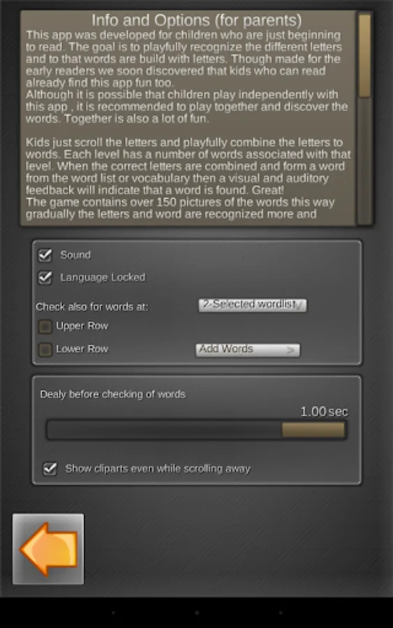 The game contains over 150 pictures of the words this way gradually the letters and word are recognized more and more.. A kind of learning by visual imprint. But really it's just fun!
