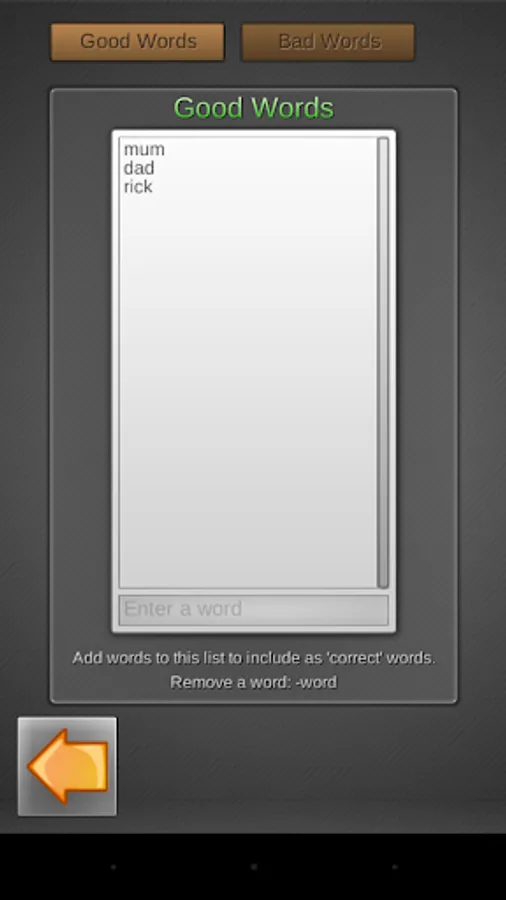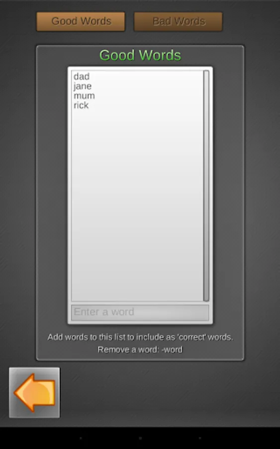 Often it is possible to combine a lot more correct words may be combined by the given letters. Although a large vocabulary of words is included, and may be selected, a limited selection of words works very good for early readers. In this paid version of the app parents can add words to the vocabulary, or mark specific words as not-to-respond-to. As a parent, you can determine how you go with this.