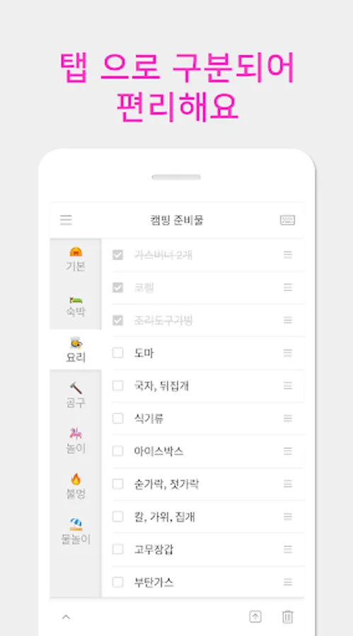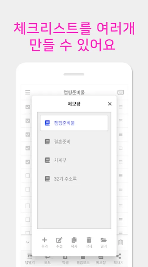 You can create multiple checklists. For example, you can create multiple checklists such as camping supplies, address book, shopping list, etc., and open and record each checklist.