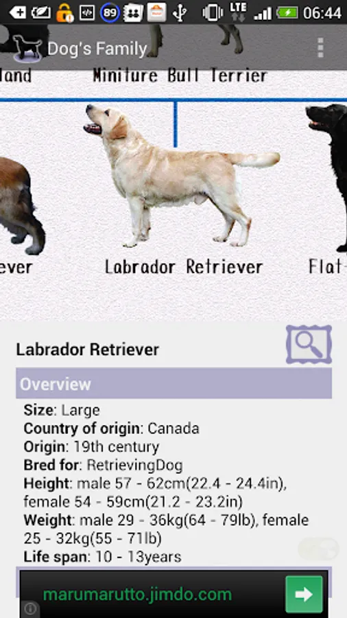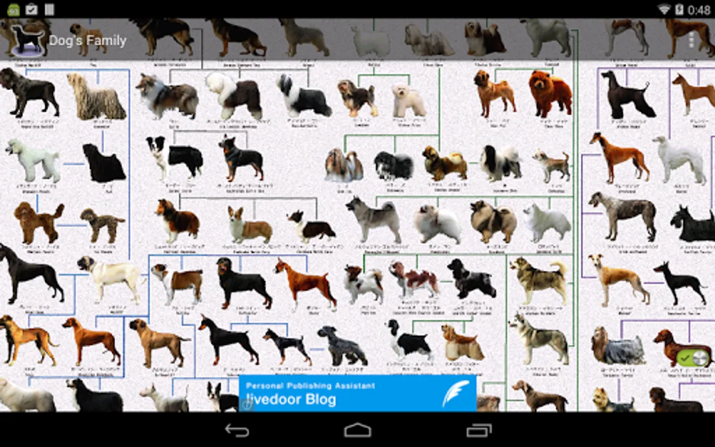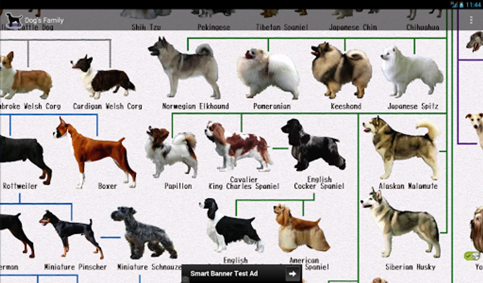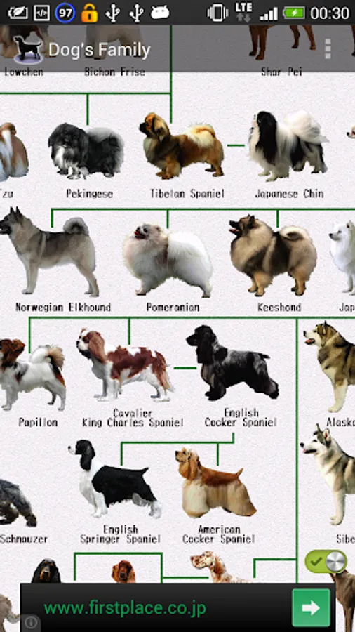 This is a family tree of dogs for dog lovers. You can see pictures of more than 100 breeds of dog and its genealogy. We also give an explanation about the character of every dog (for example, about its height, its weight, its life span and its origin).