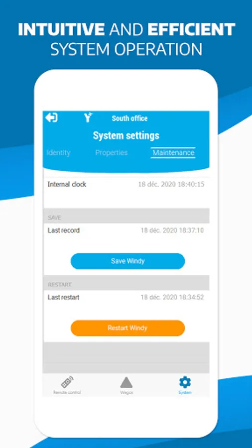 Always in Bluetooth, you connect from your mobile phone with your access code, so you can test your connection, view the status, change a setting... The application allows you to fully configure your WINDY, to easily find the cause of a failure and to act quickly by performing manual forcing.
