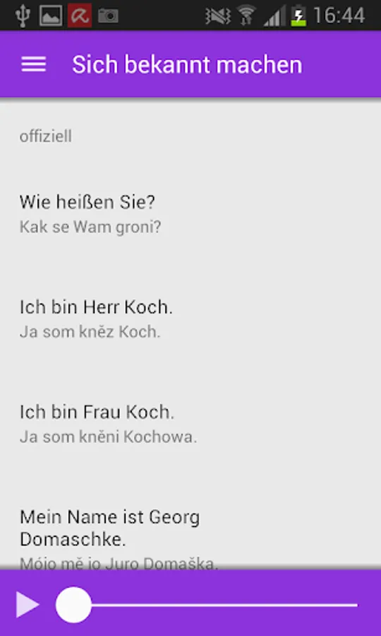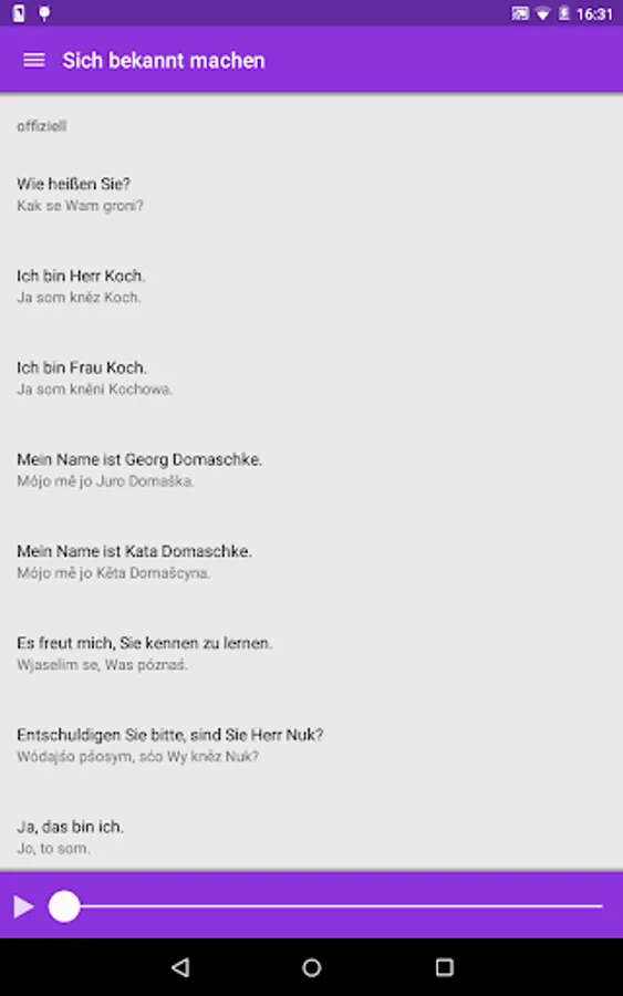You hear in the App Serbski Lazko simple phrases about everyday situations, how to greet each other and adopted, as one imagines, how asks something, for example. You also hear questions and answers for leisure and culture, food and beverage, times and more. Lower easily help you to forge contacts in the Sorbian language / Wendish Lausitz to express themselves or understand utterances in selected situations in the Sorbian / Wendish language. See Serbski Lazko also the Sorbian / Wendish alphabet and some notes on pronunciation. Maybe you Encourages App Lower easy to deal more with the Sorbian / Wendish language and culture, to broaden their language skills or to learn Sorbian / Wendisch.
