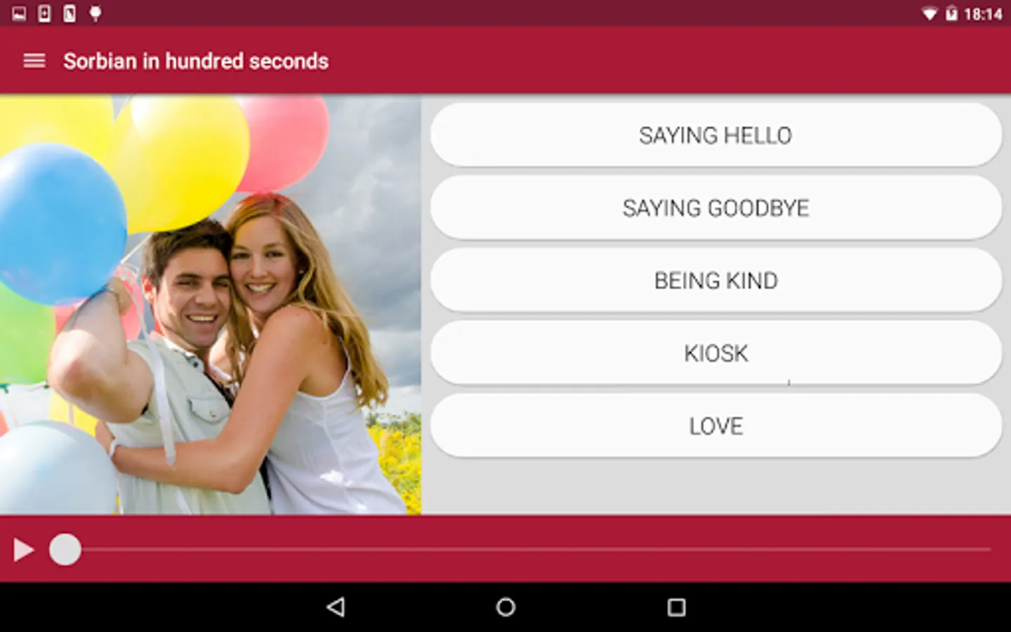 The app also includes 3 types of exercises: listening and reading, learning, writing. Based on various topics, such as food and drink, family or fruit, Sorbian vocabulary can be learned.