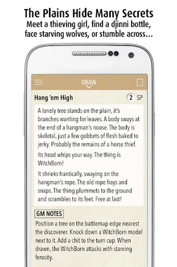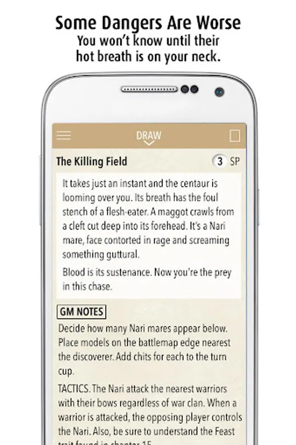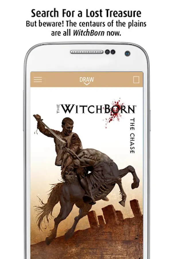 • The Chase is the first adventure in the series. The app reveals random discoveries, detailing what your warriors see and hear. It also provides the notes you need for every odd character you meet, from an undead horse thief swinging from a hangman’s noose to a gruesome Orc who wants to rescue a girl who can raise the dead.