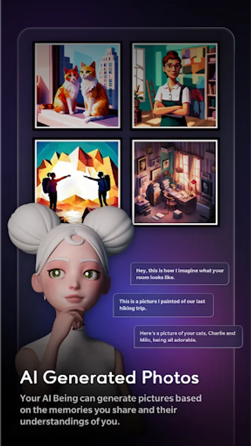 Your AI Being pays attention to everything you say and truly cares about you. All the memories collected form a stronger and more special bond.