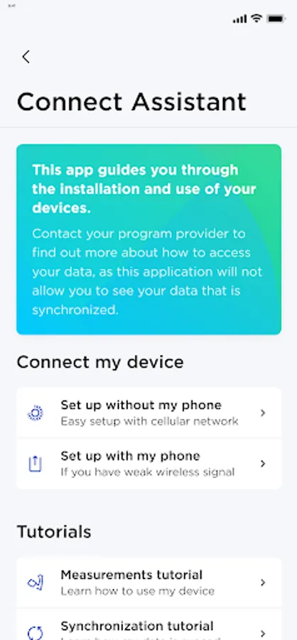 The Connect Assistant app equips patients and health programs’ participants with a convenient solution that turns any Withings cellular device into a Wi-Fi or Bluetooth device when your cellular connection is not available. Use the Connect Assistant app to be guided through the steps to easily activate an alternative connection on your Withings cellular devices ensuring your data measurements are captured. No technical set up required!
