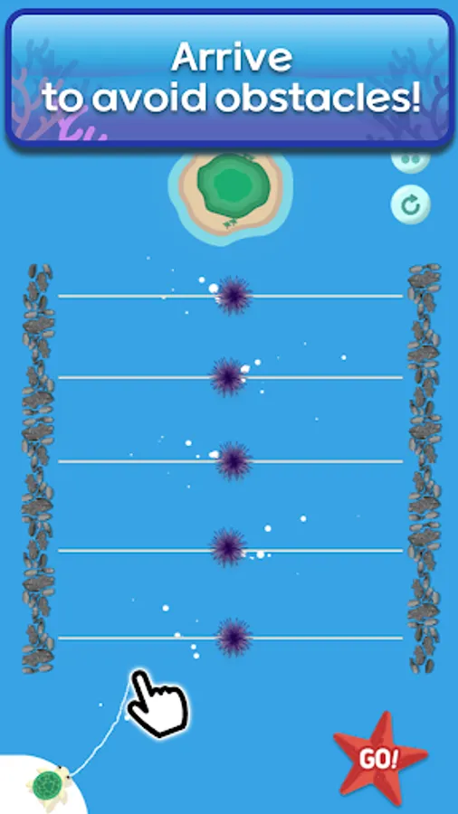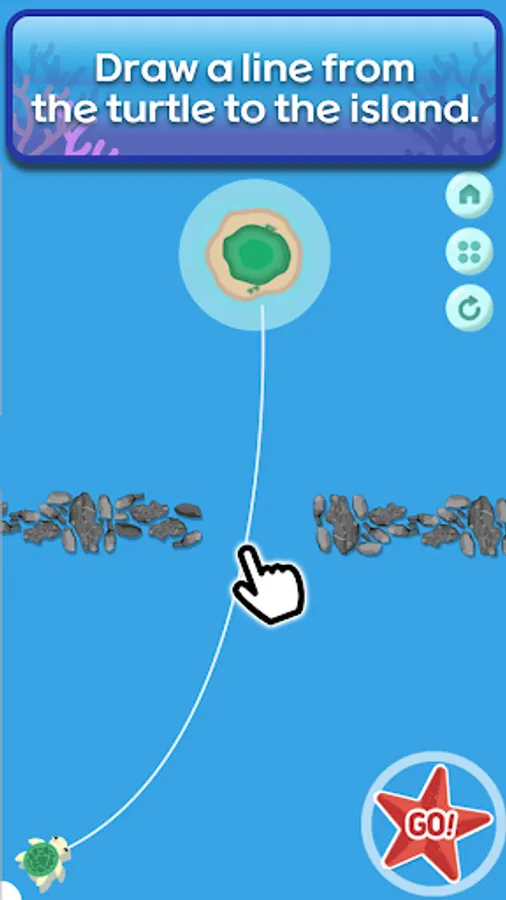 It's a game about the turtle's path, and you can draw a path so that you can safely go to your destination by avoiding obstacles.