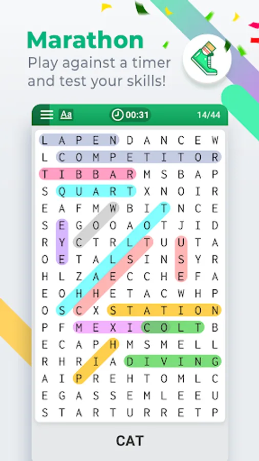 There are 8 game modes, more than 50 word categories and hundreds of exciting puzzles. Some games have time limits, others do not. It has all the elements that make a wordsearch game so much fun.