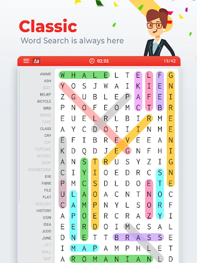 The aim is to find all the hidden words on the board. Select letters with your finger. To pass a level find all the words listed on the board. Improve your vocabulary, spelling and puzzle skills. Exercise your brain as you play.