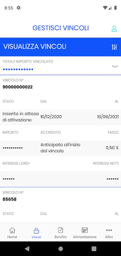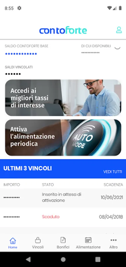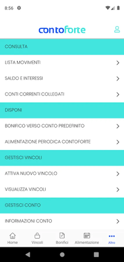 With the Contoforte APP it is possible to consult and manage the deposit account on the go: consult the movements and the list of restrictions, arrange transfers, activate new deposits and periodic top-ups to create savings plans over time.