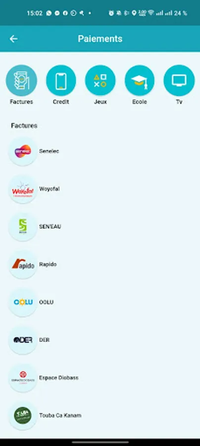 - Invoices & recharges (Woyofall, Senelec, SDE, Rapido, SODECI, CIE, Ansamble, Isago, ...)